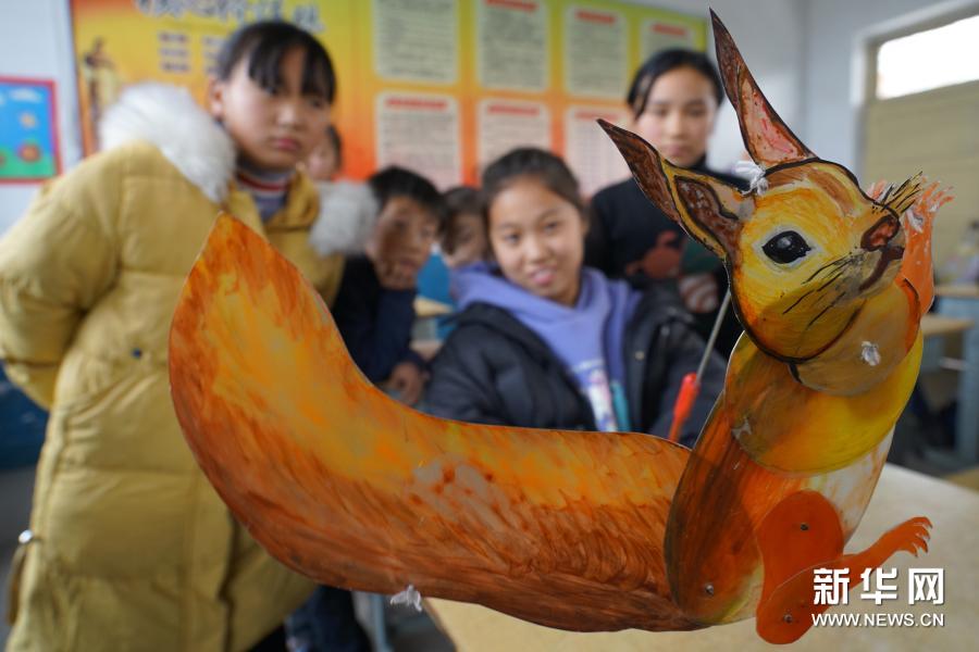 11月24日,河北省沙河市西油村小学学生在观看皮影戏表演道具。当日,在河北省沙河市,当地皮影戏艺人走进沙河市西油村小学,为学生们展演皮影艺术、传授技艺。