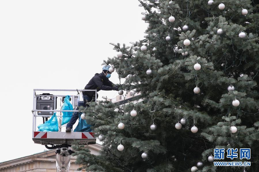 德国延长并收紧新冠防疫措施 11月26日,在德国首都柏林,工作人员装饰勃兰登堡门前的圣诞树。 德国联邦和各州政府25日晚达成协议,延长从11月初开始实施的新冠防疫限制措施至12月20日,并进一步收紧私人聚会人数限制、戴口罩等相关规定。 新华社记者 单宇琦 摄
