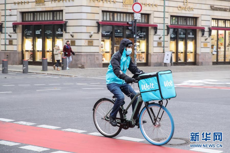 11月26日,在德国首都柏林,一名送餐员在街头骑行。 德国联邦和各州政府25日晚达成协议,延长从11月初开始实施的新冠防疫限制措施至12月20日,并进一步收紧私人聚会人数限制、戴口罩等相关规定。 新华社记者 单宇琦 摄
