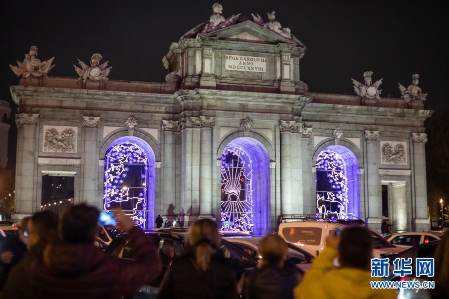 11月28日,人们在西班牙马德里阿尔卡拉门观看圣诞彩灯。