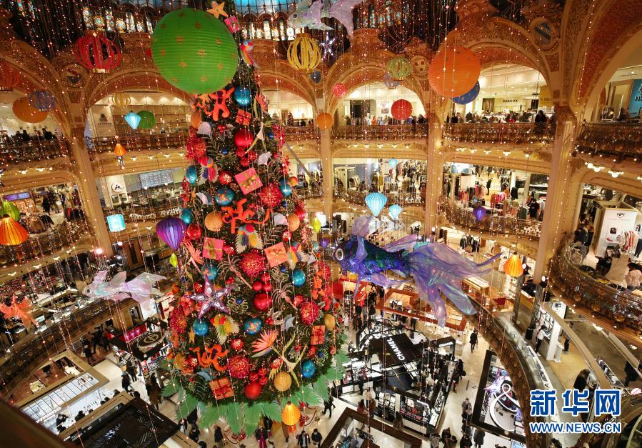 这是11月28日在法国巴黎老佛爷百货商店拍摄的巨型圣诞树。受疫情影响关闭了近一个月的老佛爷百货商店于当日重新开业。
