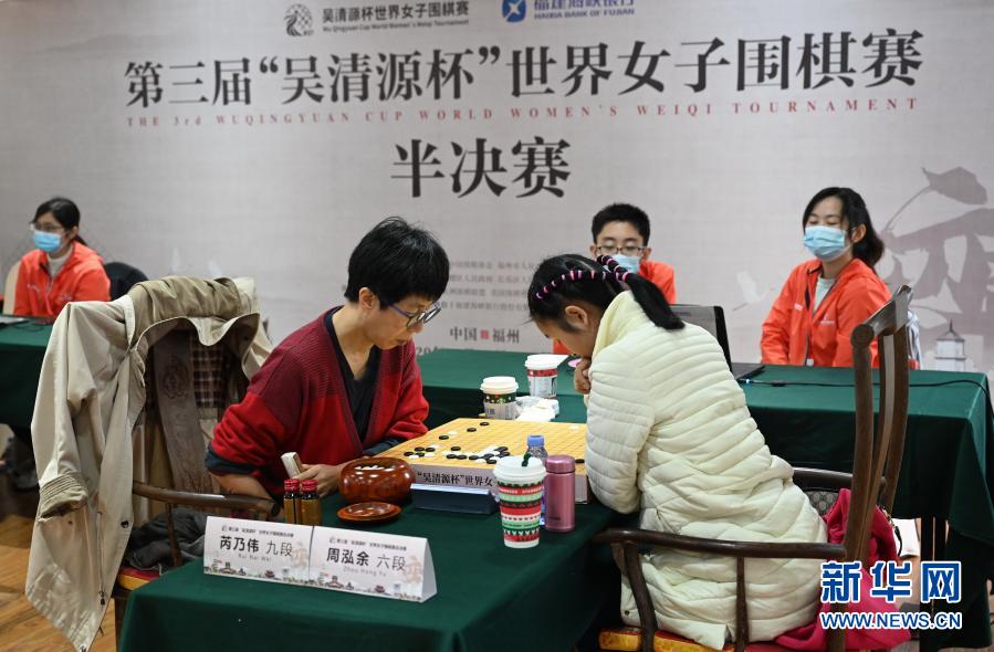 11月30日,芮乃伟九段(前左)与周泓余六段在比赛中。 当日,在福州举行的第三届“吴清源杯”世界女子围棋赛半决赛中,中国棋手於之莹六段和周泓余六段分别战胜中国棋手王晨星五段和芮乃伟九段,晋级决赛。 新华社记者林凯摄