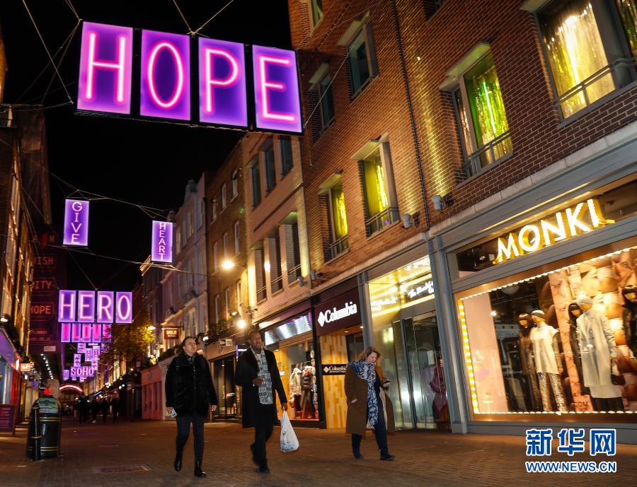 11月30日,人们在英国伦敦市中心点亮彩灯的卡纳比街上行走。