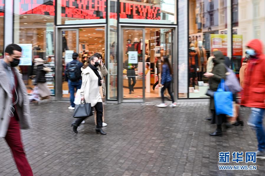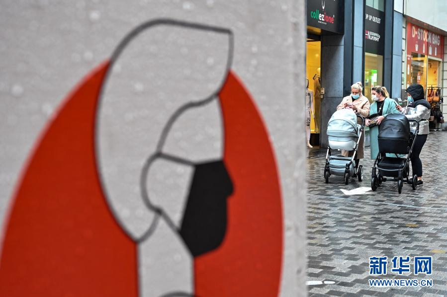 12月1日,在比利时布鲁塞尔,人们走过一处商业街内提示佩戴口罩的标识。 比利时首相亚历山大·德克罗11月27日宣布调整新冠疫情防控措施,允许“非必需品”商店12月1日起重新开业,但商家和顾客都必须遵循安全规则,包括佩戴口罩、保持社交距离、限制同时在店人数和停留时间等。 新华社记者张铖摄