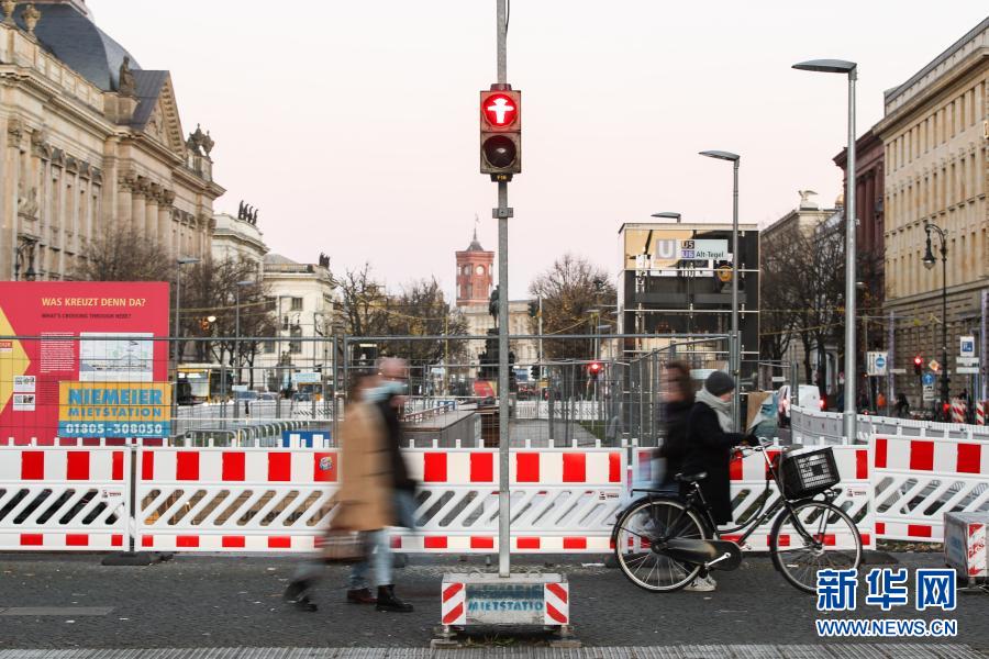 11月20日,在德国首都柏林,行人经过街头信号灯。