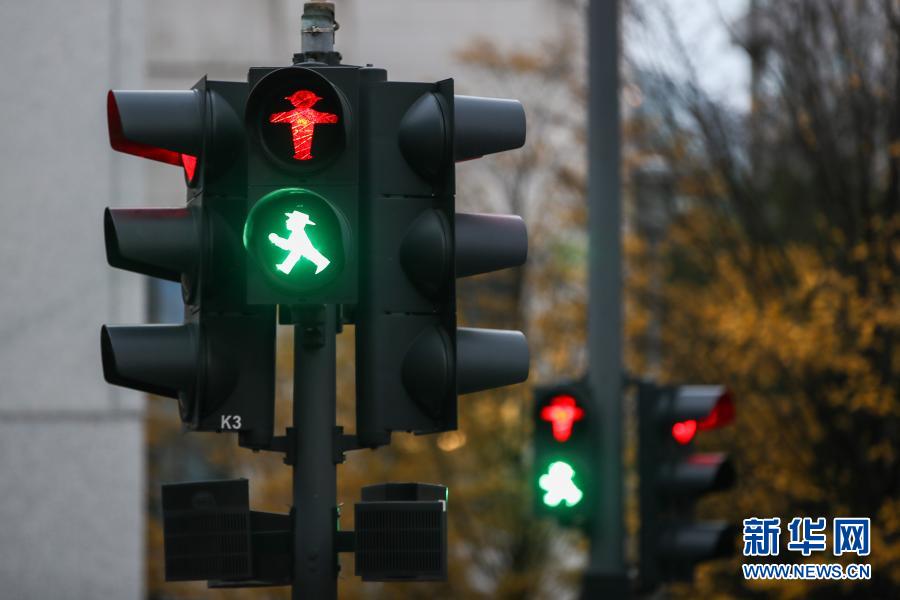 这是11月19日在德国首都柏林拍摄的行人信号灯。 柏林的人形行人信号灯于1961年由德国交通心理学家卡尔·佩格劳创作,1969年开始投入使用并逐渐普及。其设计的初衷是让对颜色不敏感的群体更好地识别行人交通信号,同时生动的人物形象更容易被人们接受。此外,这种信号灯的发光面积也比一般的行人信号灯更大,因而更加醒目。时至今日,这种“红绿灯小人”已经成为了柏林的一种文化符号。 新华社记者 单宇琦 摄