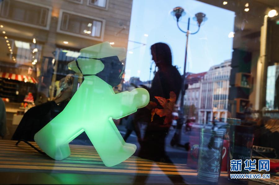 这是11月12日在德国首都柏林一家“红绿灯小人”品牌商店拍摄的橱窗内戴口罩的“绿灯小人”。 柏林的人形行人信号灯于1961年由德国交通心理学家卡尔·佩格劳创作,1969年开始投入使用并逐渐普及。其设计的初衷是让对颜色不敏感的群体更好地识别行人交通信号,同时生动的人物形象更容易被人们接受。此外,这种信号灯的发光面积也比一般的行人信号灯更大,因而更加醒目。时至今日,这种“红绿灯小人”已经成为了柏林的一种文化符号。 新华社记者 单宇琦 摄
