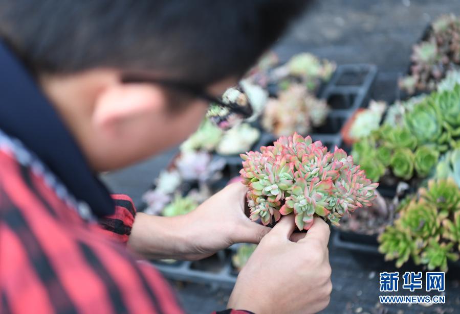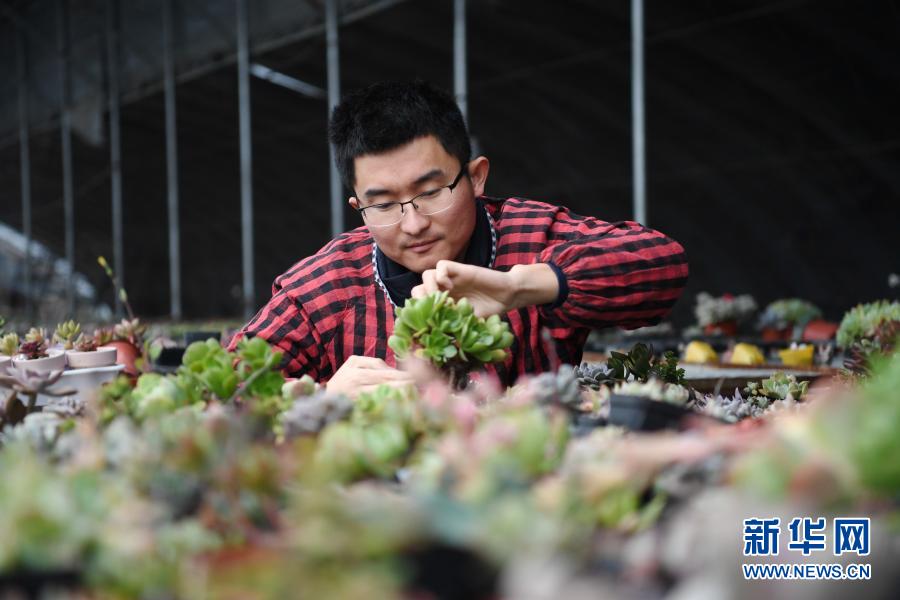 12月2日,张晓东在“多肉花园”打理多肉盆栽。 今年30岁的张晓东是河北省邯郸市曲周县曲周镇临堂村人,大学毕业后在邯郸工作。一次回乡探亲时,他了解到家乡曲周县推出了针对返乡创业的诸多优惠政策,张晓东动了心。2014年,考察多肉植物的种植前景后,张晓东开始扎根乡村的创业计划。 从多肉栽培、养护到开拓市场,张晓东从零开始学习,当地政府也积极协调技术员进行指导,帮他解决了不少难题。经过短短几年的经营,张晓东打造的“西木多肉花园”已初具规模。目前,张晓东通过网络、微信、实体店等方式将产品销往全国各地。尝到甜头的张晓东辐射带动周边村民发展多肉种植,越来越多的群众加入了多肉产业致富增收的队伍。 新华社记者 朱旭东 摄