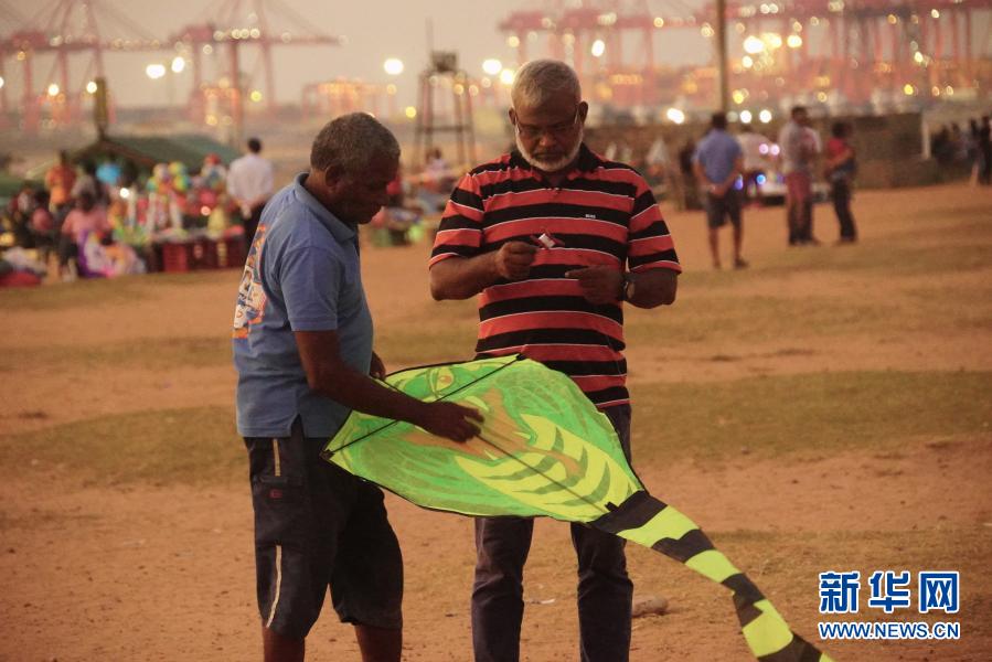 这张拍摄于2019年1月10日的资料照片显示,纳瓦(左)在斯里兰卡首都科伦坡加勒菲斯绿地广场上帮助一名游客调整风筝。新华社记者 唐璐 摄