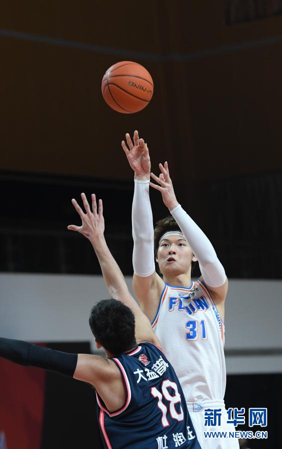 12月7日,福建豹发力队球员王哲林(上)在比赛中投篮。 当日,在浙江诸暨举行的2020-2021赛季中国男子篮球职业联赛(CBA)第二阶段第15轮比赛中,广东东莞大益队以153比145战胜福建豹发力队。 新华社记者 翁忻旸 摄