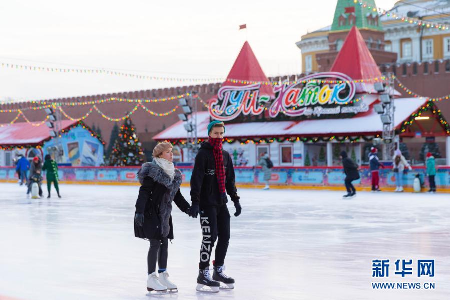 12月2日,人们在俄罗斯莫斯科红场上的古姆百货商场滑冰场滑冰。