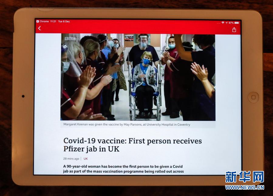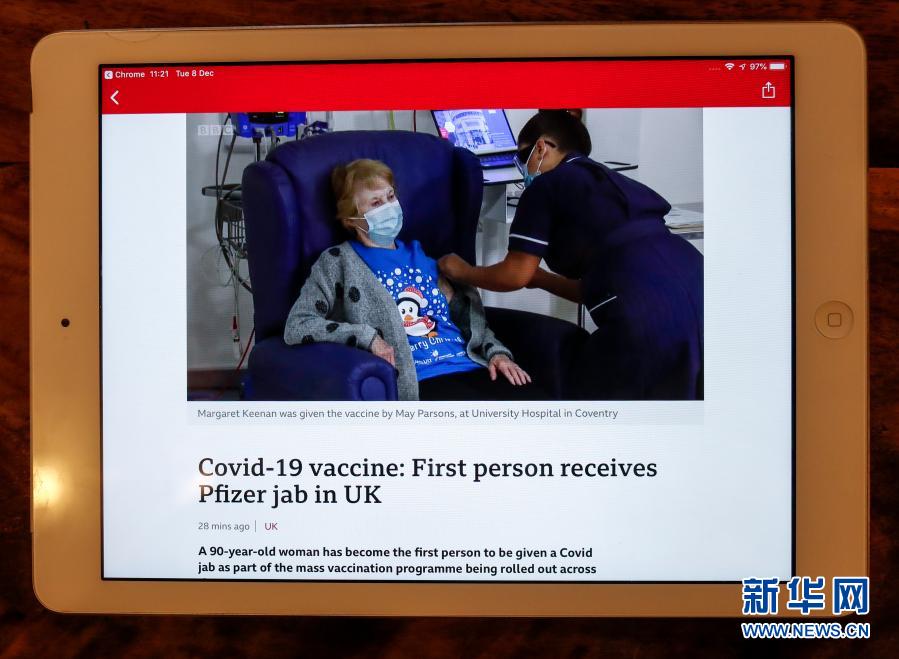 12月8日在英国伦敦拍摄的播放新闻的电脑屏幕显示,90岁女子玛格丽特·基南成为该国首位接种新冠疫苗的人。 当日,英国开始接种新冠疫苗,将优先接种护理院人员、80岁以上人士以及一线医护和社会工作者,然后才给其他人群提供接种服务,届时还会按照年龄和感染风险来决定接种的先后顺序。英国政府12月2日宣布,该国的监管机构已批准德国生物新技术公司与美国辉瑞制药有限公司合作研发的新冠疫苗投入使用,这也是首款在英国获批使用的新冠疫苗。 新华社记者韩岩摄