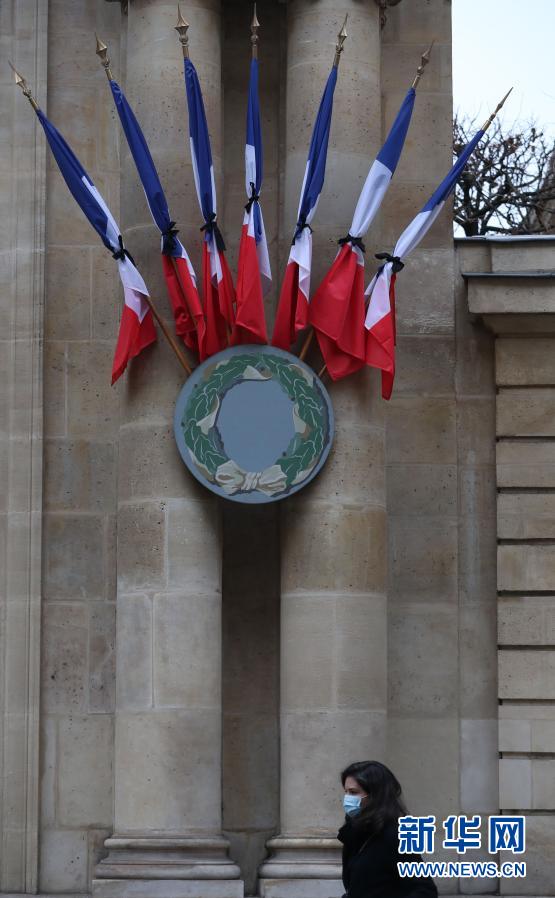 12月9日,法国巴黎国民议会外的国旗用黑丝带束起,悼念2日逝世的前总统德斯坦。
