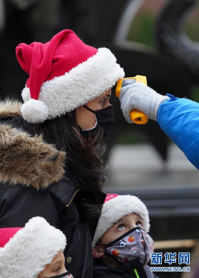 12月8日,在美国纽约洛克菲勒中心,工作人员为准备进入溜冰场的顾客测体温。