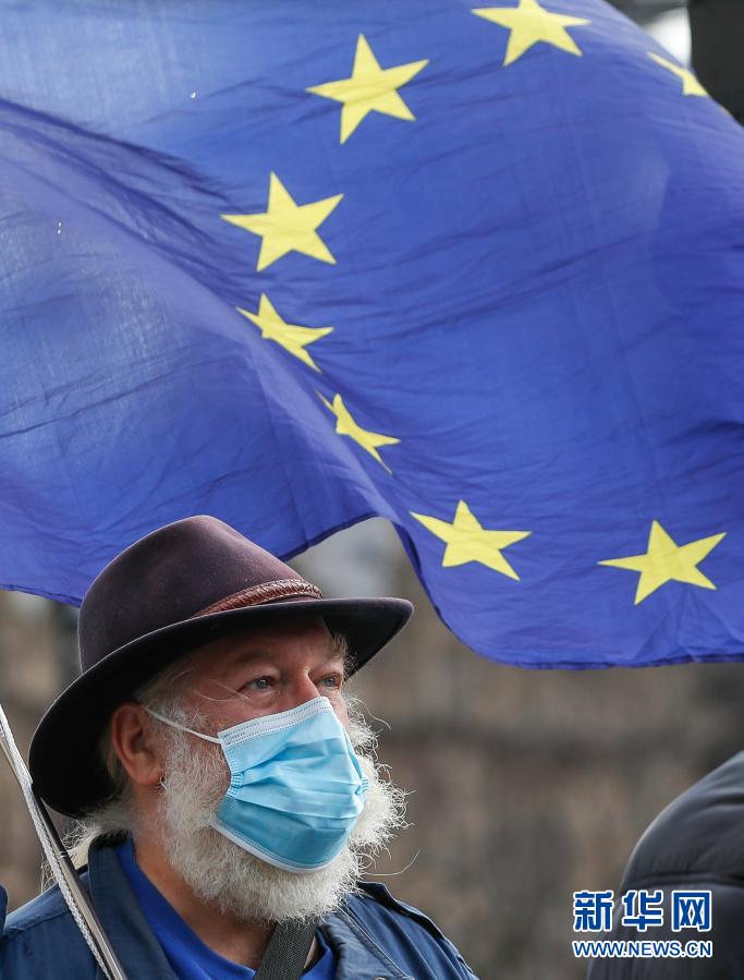 12月9日,反对“脱欧”的示威者手举欧盟旗帜站在英国伦敦议会大厦外。