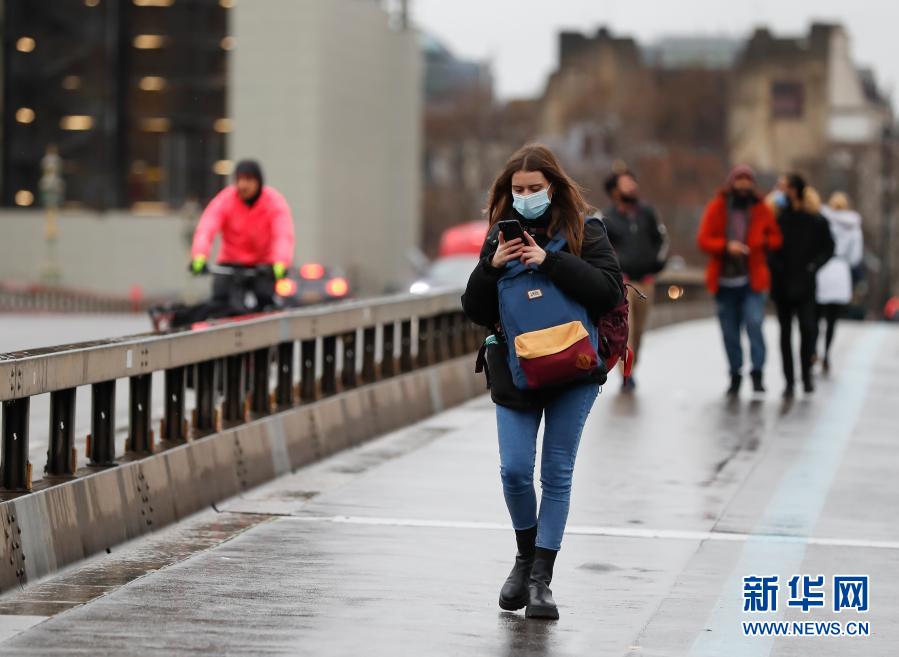 12月13日,一名戴着口罩的女子在英国伦敦的威斯敏斯特桥上行走。 英国政府12月11日宣布,经专家们评估,该国决定将与新冠病毒感染者有密切接触的人自我隔离期从原本的14天缩短至10天。 新华社记者韩岩摄