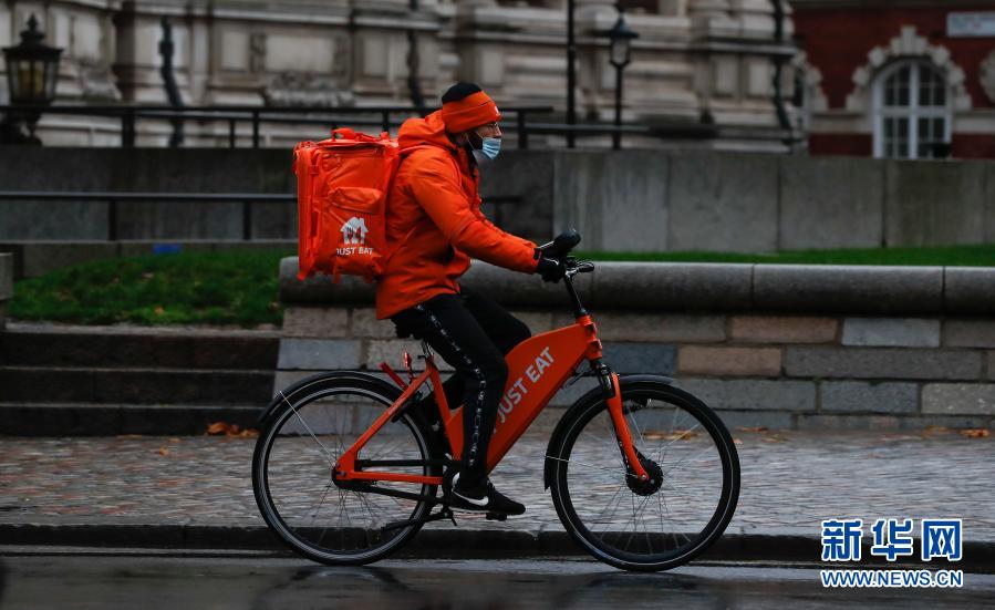 12月13日,戴口罩的送餐员在英国伦敦市中心骑行。 英国政府12月11日宣布,经专家们评估,该国决定将与新冠病毒感染者有密切接触的人自我隔离期从原本的14天缩短至10天。 新华社记者韩岩摄