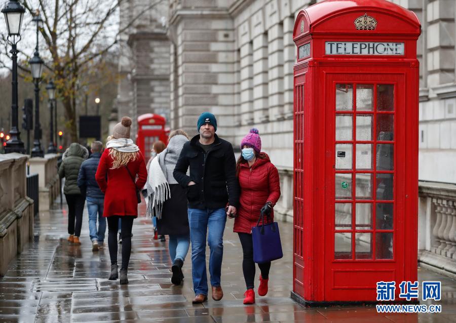 12月13日,人们从英国伦敦市中心的红色电话亭旁走过。 英国政府12月11日宣布,经专家们评估,该国决定将与新冠病毒感染者有密切接触的人自我隔离期从原本的14天缩短至10天。 新华社记者韩岩摄