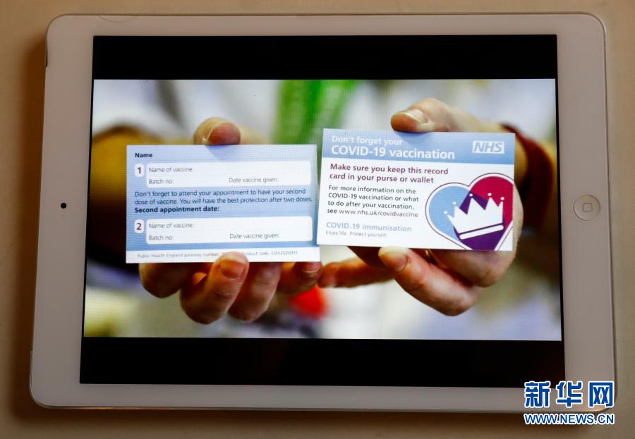 这是12月8日在英国伦敦拍摄的显示新冠疫苗接种卡的电脑屏幕。 当日,英国开始接种新冠疫苗,将优先接种护理院人员、80岁以上人士以及一线医护和社会工作者,然后才给其他人群提供接种服务,届时还会按照年龄和感染风险来决定接种的先后顺序。英国政府12月2日宣布,该国的监管机构已批准德国生物新技术公司与美国辉瑞制药有限公司合作研发的新冠疫苗投入使用,这也是首款在英国获批使用的新冠疫苗。 新华社记者韩岩摄