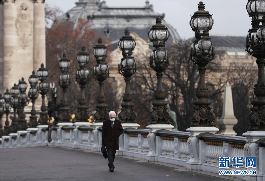 12月9日,一名戴口罩的男子走在法国巴黎亚历山大三世桥上。 法国防疫专家埃里克·科姆7日说,就法国疫情趋势看,可能难以在12月15日实现目标,即单日新增新冠确诊病例降至5000例以下。这是法国政府先前设定的第二阶段“解封”前提。 新华社记者 高静 摄