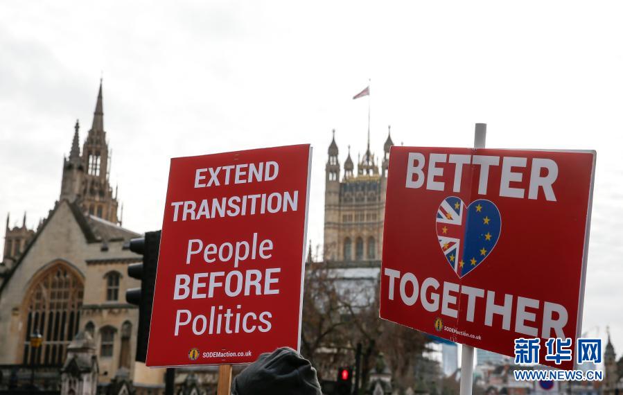 12月9日,反对“脱欧”的示威者手举标语牌站在英国伦敦议会大厦外。 当日,英国首相约翰逊前往布鲁塞尔与欧盟委员会主席冯德莱恩进行会晤,双方将为推动以贸易协议为核心的未来关系谈判做最后努力。 新华社记者韩岩摄