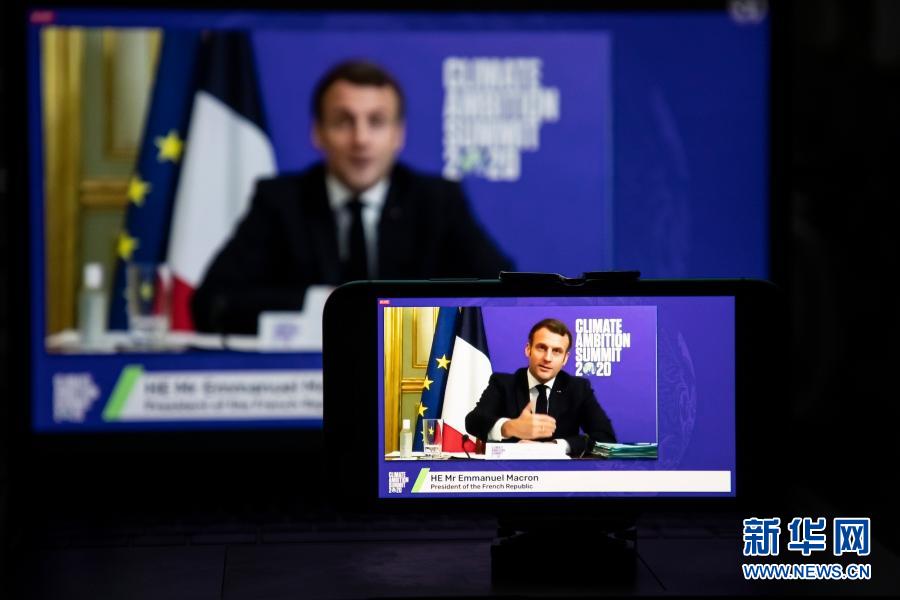 这是12月12日在美国纽约拍摄的法国总统马克龙在气候雄心峰会上通过视频发表讲话的屏幕画面。 当日,2020气候雄心峰会以视频方式举行。气候雄心峰会由联合国及有关国家倡议举办,旨在纪念《巴黎协定》达成五周年,进一步动员国际社会强化气候行动,推进多边进程。 新华社记者 王迎 摄