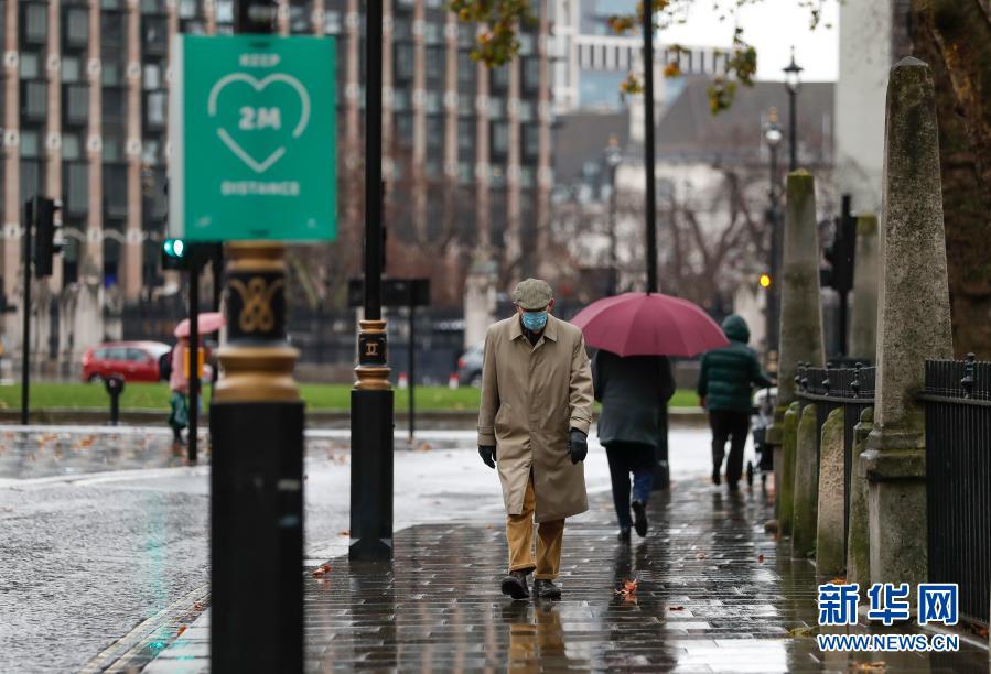 12月13日,一名戴着口罩的老人在雨中的英国伦敦街头行走。 英国政府12月11日宣布,经专家们评估,该国决定将与新冠病毒感染者有密切接触的人自我隔离期从原本的14天缩短至10天。 新华社记者韩岩摄