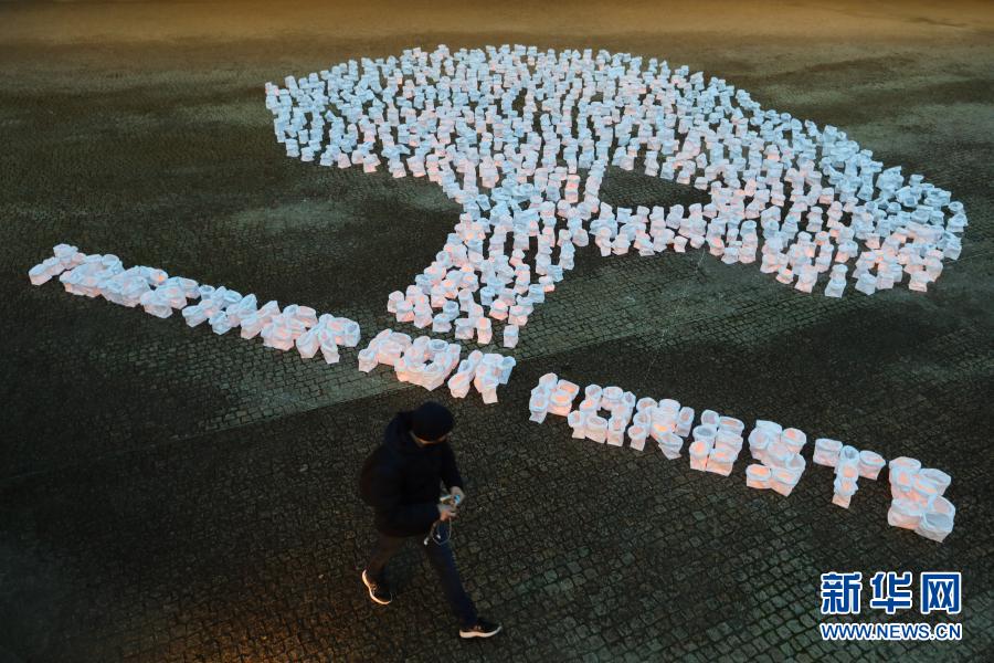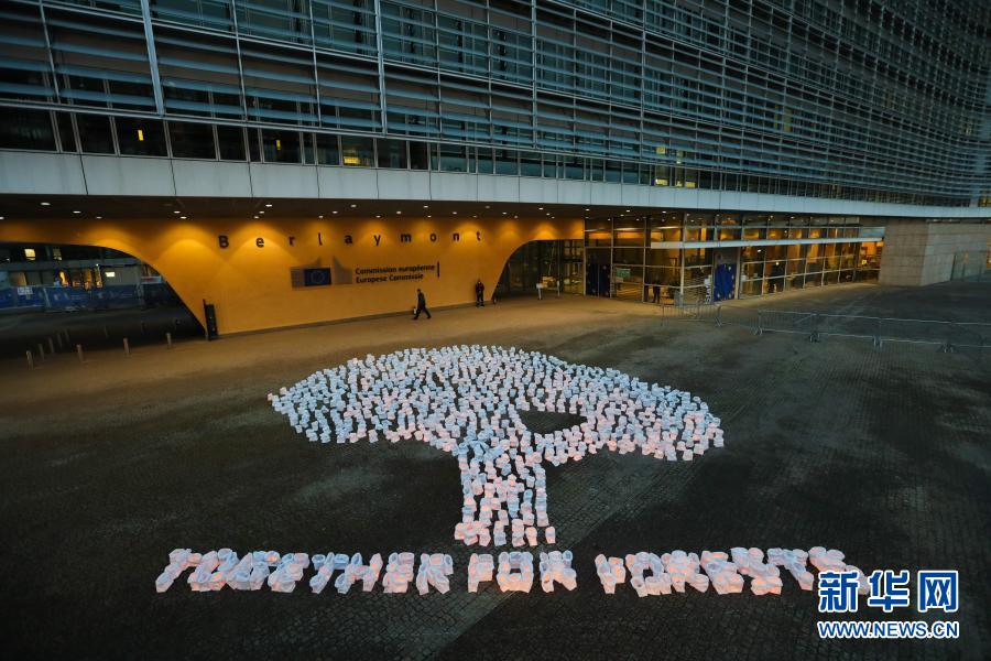 12月14日,环保人士在比利时布鲁塞尔的欧盟委员会总部外摆放呼吁保护森林的图案。 当天,环保人士在比利时布鲁塞尔的欧盟委员会总部外举行活动,用装有蜡烛的纸袋摆成树木的形状,呼吁人们保护森林。 新华社记者 郑焕松 摄