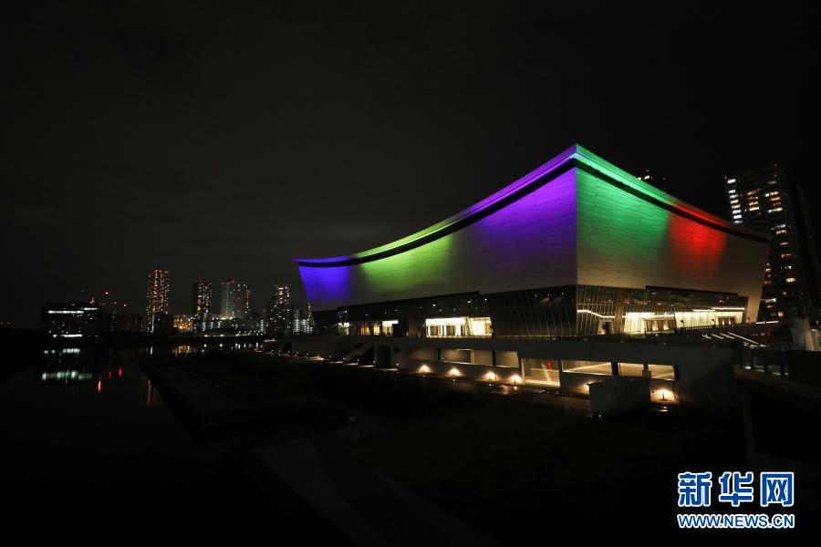 这是2020年7月23日在日本东京拍摄的东京奥运会排球比赛场馆有明体育馆夜景。当日,该场馆亮起灯光,纪念延期后的东京奥运会倒计时一周年。