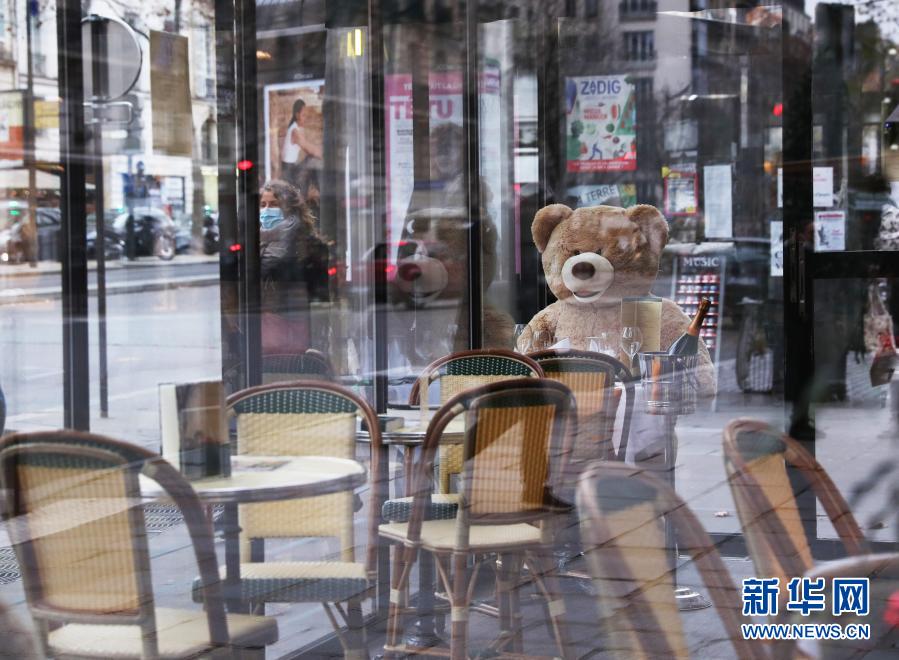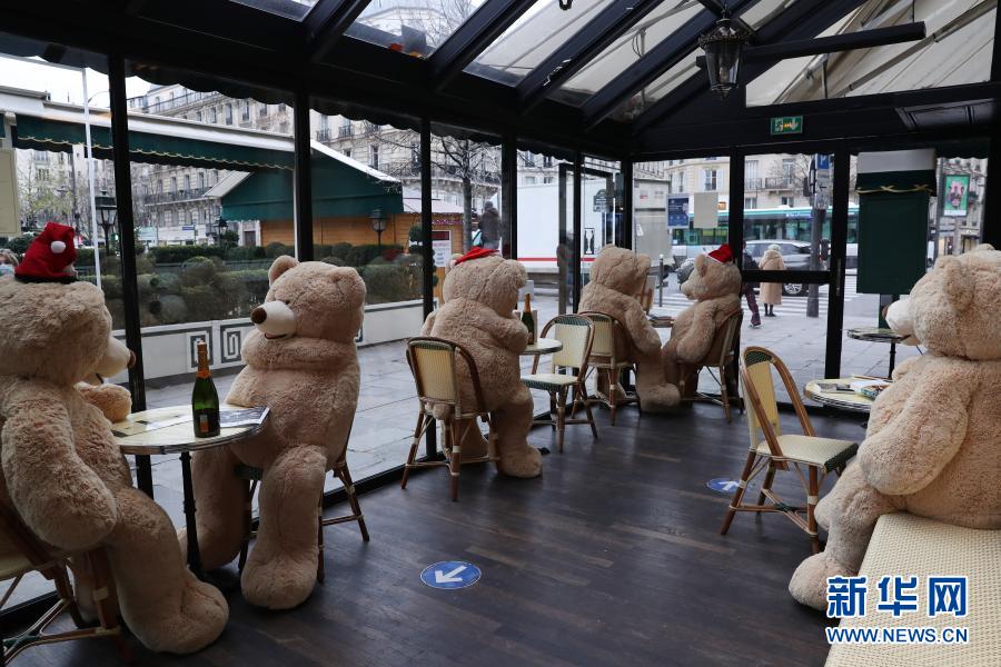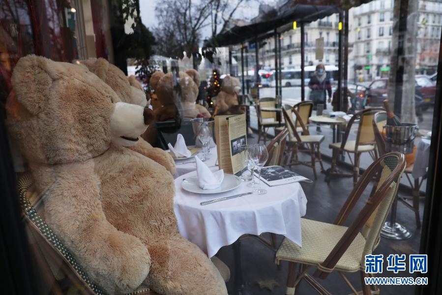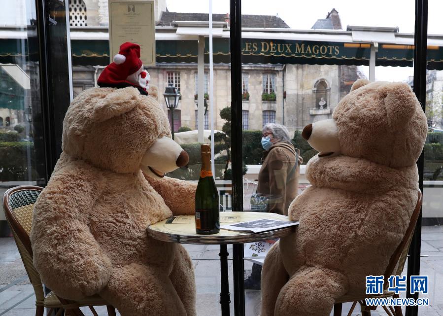 这是12月16日在法国巴黎双叟咖啡馆拍摄的玩具熊。 近日,法国巴黎著名的双叟咖啡馆被一群玩具熊“占领”,为因新冠疫情而关闭的咖啡馆带来一些幽默的“烟火气”和节日气氛,引起路人驻足围观。 新华社记者 高静 摄