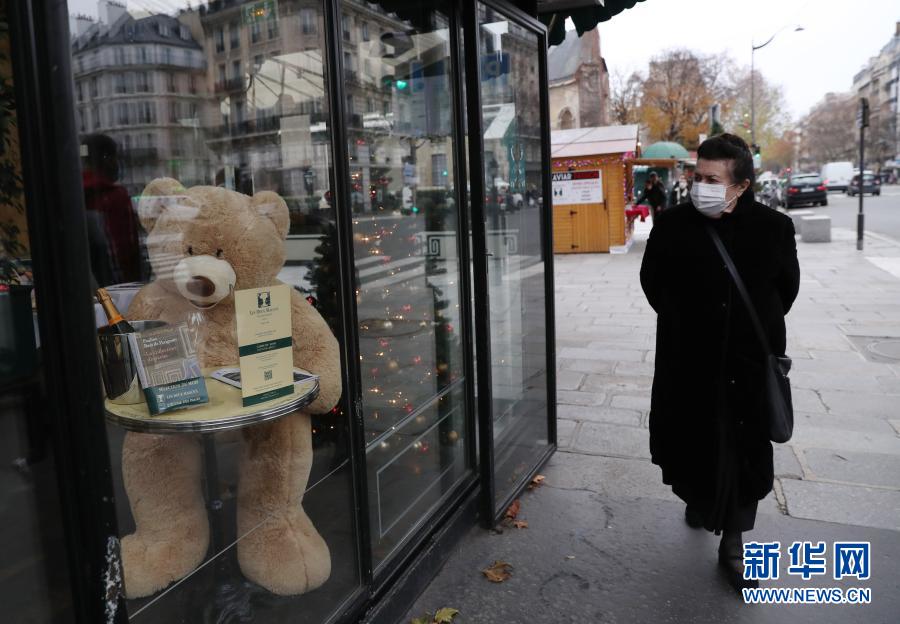 12月16日,路人在法国巴黎双叟咖啡馆外观看玩具熊。 近日,法国巴黎著名的双叟咖啡馆被一群玩具熊“占领”,为因新冠疫情而关闭的咖啡馆带来一些幽默的“烟火气”和节日气氛,引起路人驻足围观。 新华社记者 高静 摄
