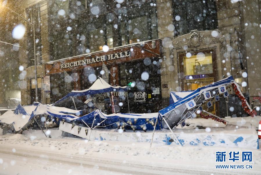 12月16日,在美国纽约,一家餐厅的户外就餐区被暴风雪毁坏。 当天,美国纽约遭遇暴风雪天气。 新华社记者 王迎 摄