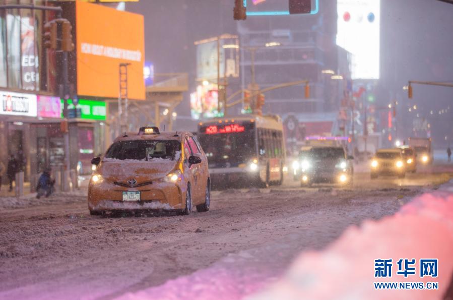 12月16日,在美国纽约时报广场,车辆通过积雪的道路。 当天,美国纽约遭遇暴风雪天气。 新华社记者 王迎 摄