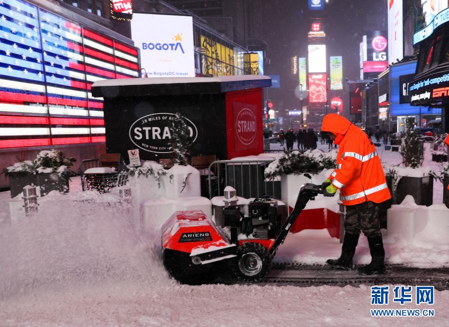 12月16日,在美国纽约时报广场,工人在清扫积雪。 当天,美国纽约遭遇暴风雪天气。 新华社记者 王迎 摄