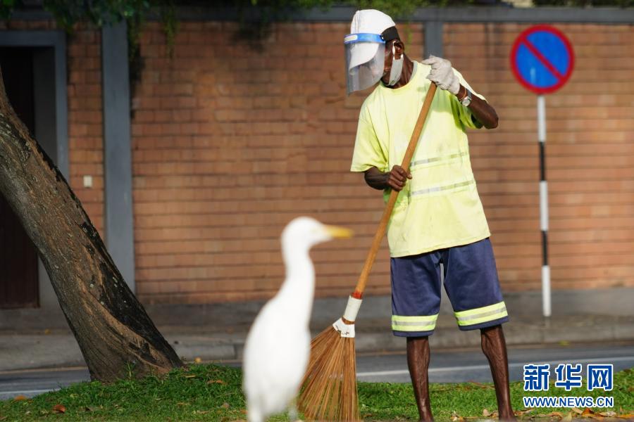 12月19日,一名清洁工人在斯里兰卡科伦坡贝拉湖畔打扫卫生。 位于斯里兰卡科伦坡市中心的贝拉湖被称为“城市绿洲”,鹈鹕和鹭鸶是这里的常客,偶尔也有彩鹳等其他鸟类驻留。 新华社记者 唐璐 摄