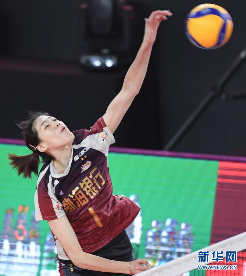 12月18日,天津渤海银行队球员朱婷在比赛中垫球。 当日,在广东江门举行的2020-2021赛季中国女子排球超级联赛决赛第三场比赛中,天津渤海银行队以3比1战胜江苏中天钢铁队,从而以2比1的总比分夺得冠军。 新华社记者 邓华 摄