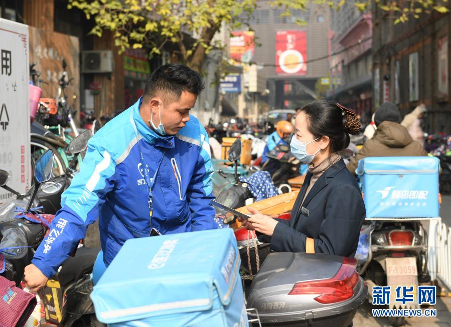 12月24日,湖州吴兴区爱山街道“骑士驿站”的工作人员在商圈向快递小哥介绍附近的“骑士驿站”,欢迎其前来光顾。 中国邮政湖州市分公司开辟近20个“骑士驿站”,为快递小哥提供包括便民百宝箱、骑士工具箱、健康医药箱、饮用水补给、设备充电等服务。 新华社记者 翁忻旸 摄