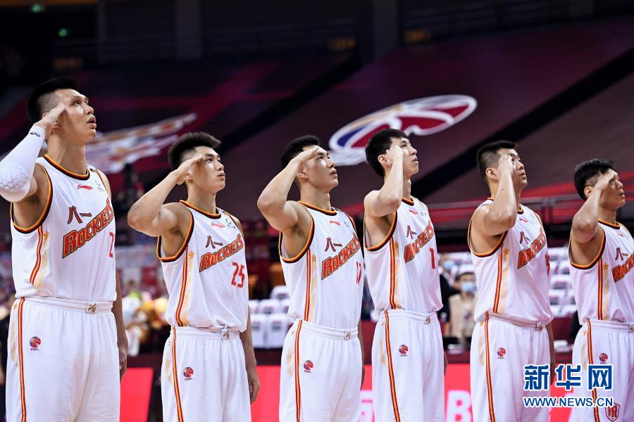 这是2020年7月14日,八一南昌队球员在山东青岛举行的2019-2020赛季中国男子篮球职业联赛(CBA)复赛第二阶段(红岛赛区)对阵浙江广厦控股队比赛前的升旗仪式上。新华社记者 朱峥 摄