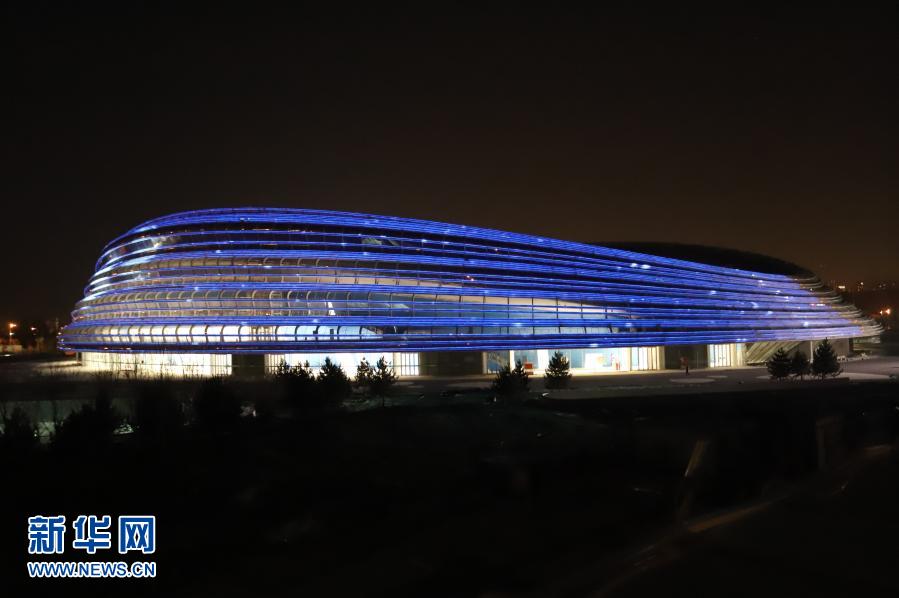 这是2020年12月15日,国家速滑馆“冰丝带”进行场馆外立面泛光照明调试。新华社记者 张骁 摄