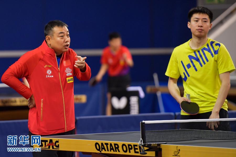 这是2020年2月10日,刘国梁(左)指导在卡塔尔首都多哈训练的中国乒乓球队队员。新华社发(尼库摄)
