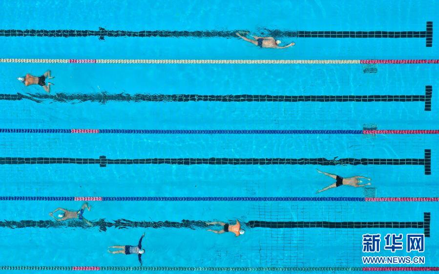 这是2020年3月26日,市民在广州西郊泳场畅游(无人机照片)。新华社记者 刘大伟 摄