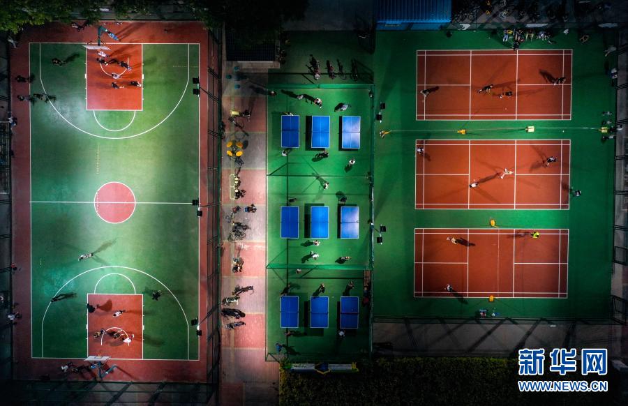这是2020年7月29日,市民在宁夏银川市毓秀公园运动场内锻炼(无人机照片)。新华社记者 冯开华 摄