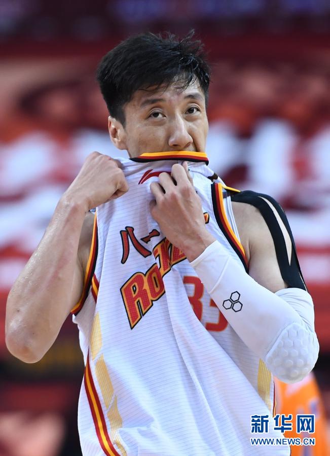 这是2020年7月17日,八一南昌队球员韩硕在山东青岛举行的2019-2020赛季中国男子篮球职业联赛(CBA)复赛第二阶段(红岛赛区)对阵上海久事队的比赛中擦汗。新华社记者 朱峥 摄