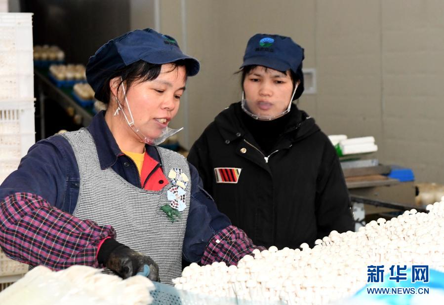 1月2日,顺昌县郑坊镇邓坊村脱贫妇女卢秋英(左)在当地农企“神农菇业”包装车间务工。