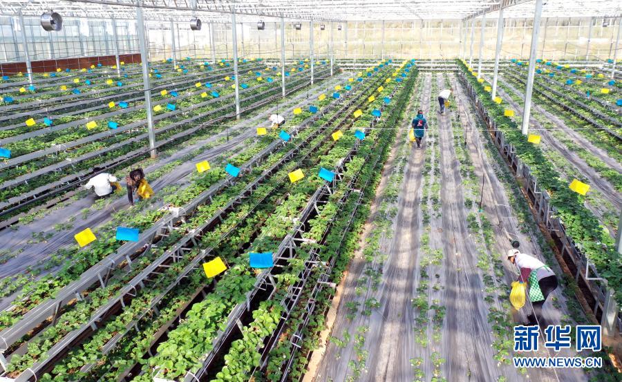 1月2日,顺昌县郑坊镇农民在当地农企“明晶农业”草莓种苗生产智慧玻璃温室里务工。