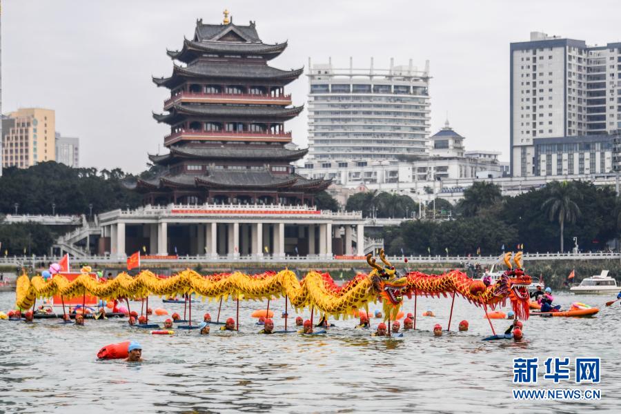 1月1日,在广西南宁,游泳爱好者舞龙横渡邕江。 当日,2021年冬泳邕江活动在广西南宁举行。来自南宁、柳州、桂林等地的近500名冬泳运动爱好者横渡邕江,迎接新年。 新华社记者 曹祎铭 摄