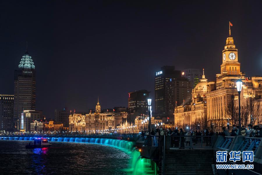 2021年1月2日,人们在上海外滩欣赏光影秀。新华社记者 王翔 摄