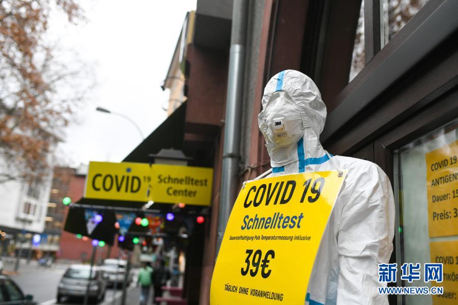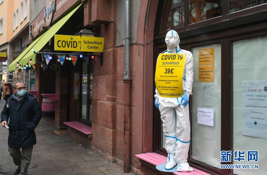 德国法兰克福一处新冠病毒检测中心外的着防护服的人型模特(1月6日摄)。 德国疾控机构罗伯特·科赫研究所5日公布的疫情数据显示,截至当天零时,德国新增新冠确诊病例11897例,累计确诊1787410例;新增死亡病例944例,累计死亡35518例。德国联邦和各州政府5日达成新协议,将目前实行的新冠防疫措施延长至1月31日,并将限制疫情严重地区居民的出行范围。 新华社记者 逯阳 摄