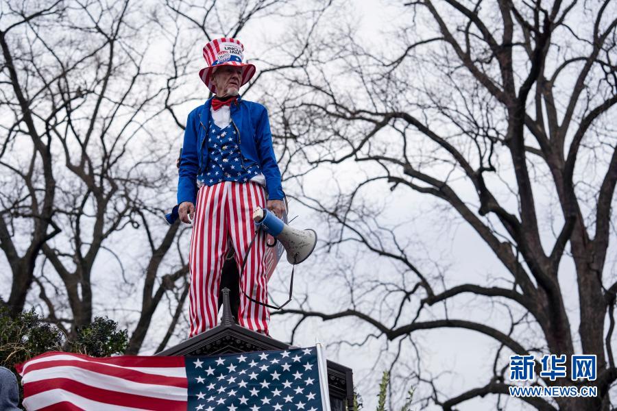 1月6日,在美国首都华盛顿,一名美国总统特朗普的支持者参加示威游行。