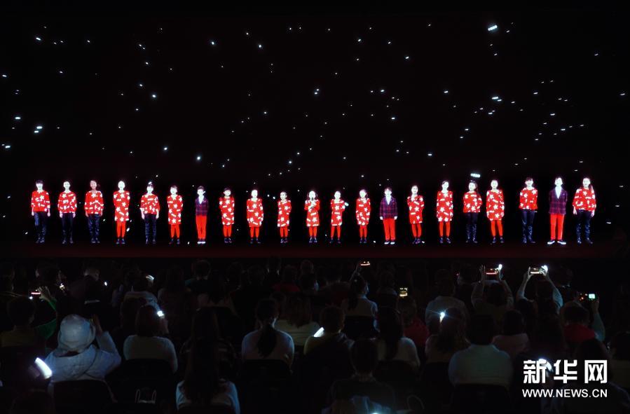 1月5日在发布会现场拍摄的意大利安东尼亚诺小合唱团的全息演出展示。新华社记者 刘颖 摄
